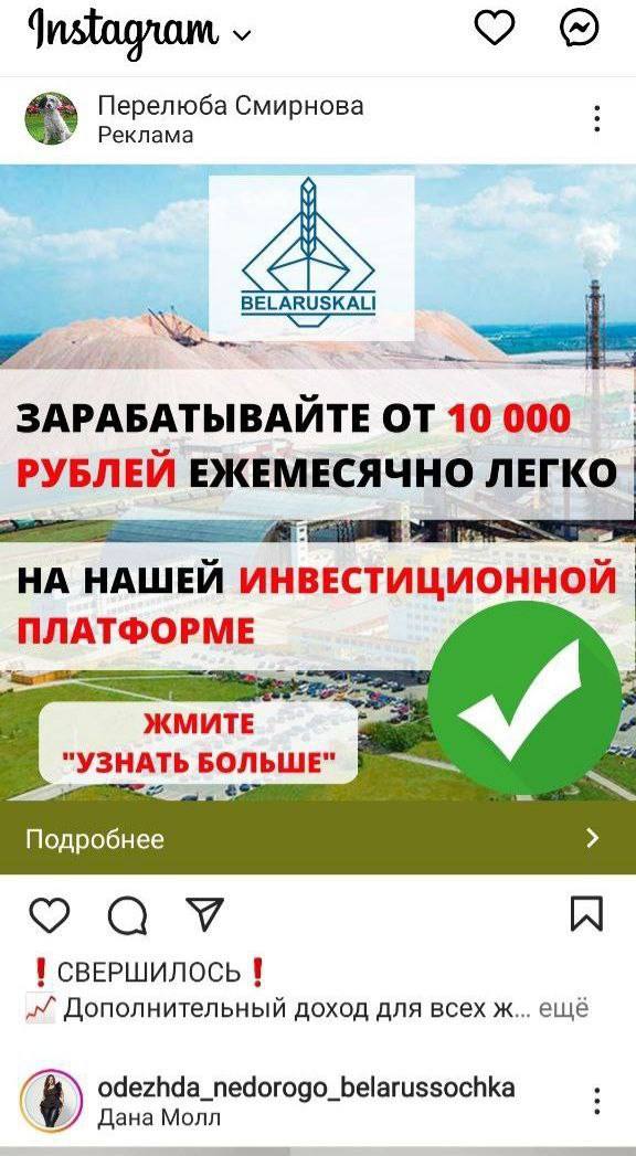 «ОАО "Беларуськалий" официально заявляет, что не проводит и не планирует организацию каких-либо "программ инвестирования" и других финансовых мероприятий с использованием соцсетей, в том числе Instagram. Аккаунты, которые размещают подобную информацию, к нашему предприятию какого-либо отношения не имеют», – говорится в сообщении.