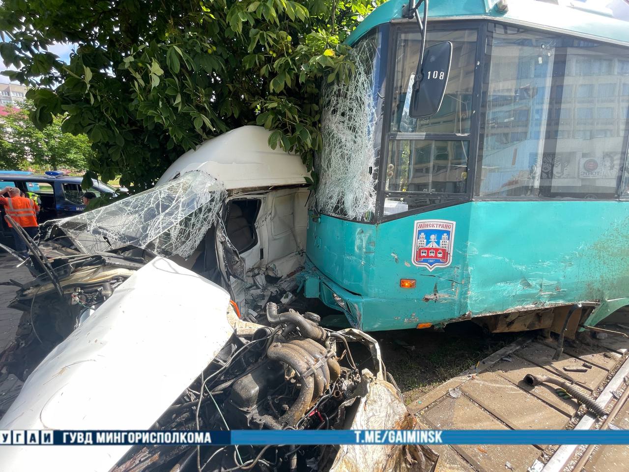 На проспекте Машерова на трамвайные пути выскочил микроавтобус. Трамвай буквально смял машину.