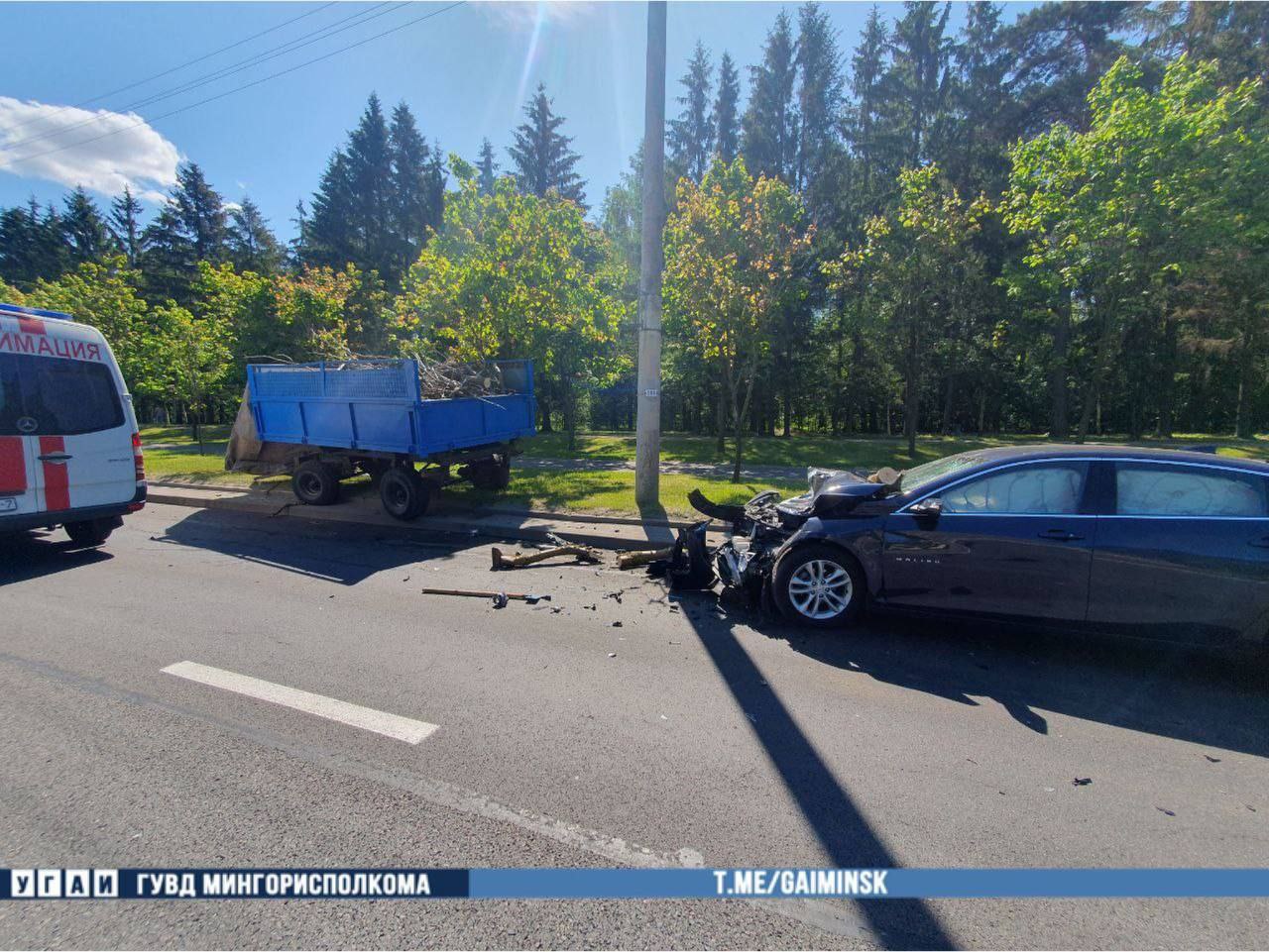ДТП случилось 5 июня, в районе половины одиннадцатого утра. Сидевший за рулем Chevrolet 23-летний мужчина ехал по проспекту Независимости, направляясь к улице Героев 120-й Дивизии, перестраиваясь из третьей в первую полосу для движения, врезался в трактор с прицепом. От удара прицеп вынесло за пределы дороги.