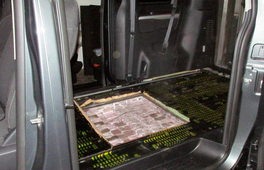 Машина ехала по так называемому зелёному коридору. При оформлении её решили проверить со служебными собаками – и те учуяли неладное. В полу микроавтобуса обнаружено двойное дно, а там – крупная партия психотропов, упакованная в брикеты.