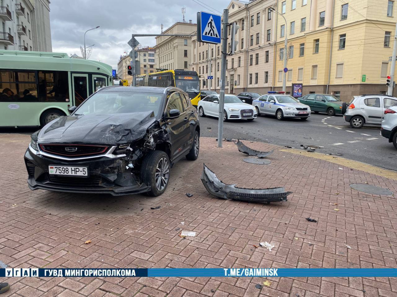 Авария с участием двух легковушек Geely произошла 28 сентября на улице Свердлова в Минске. Об этом сообщили в ГАИ.
