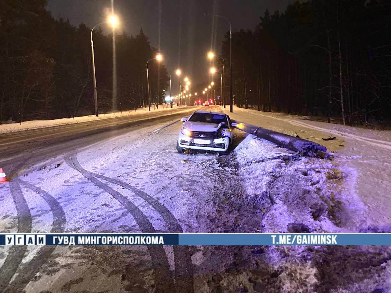 Такси потеряло управление и врезалось в осветительную мачту в Минске. От удара она упала на машину