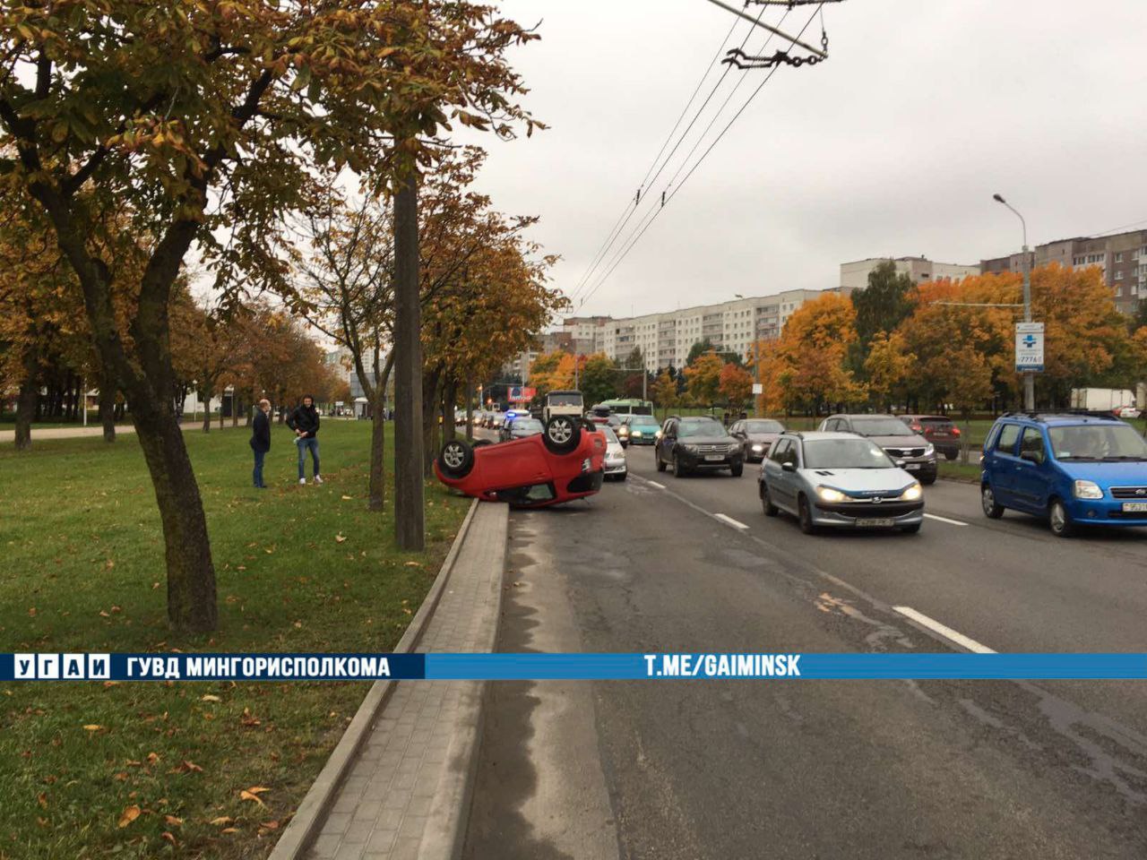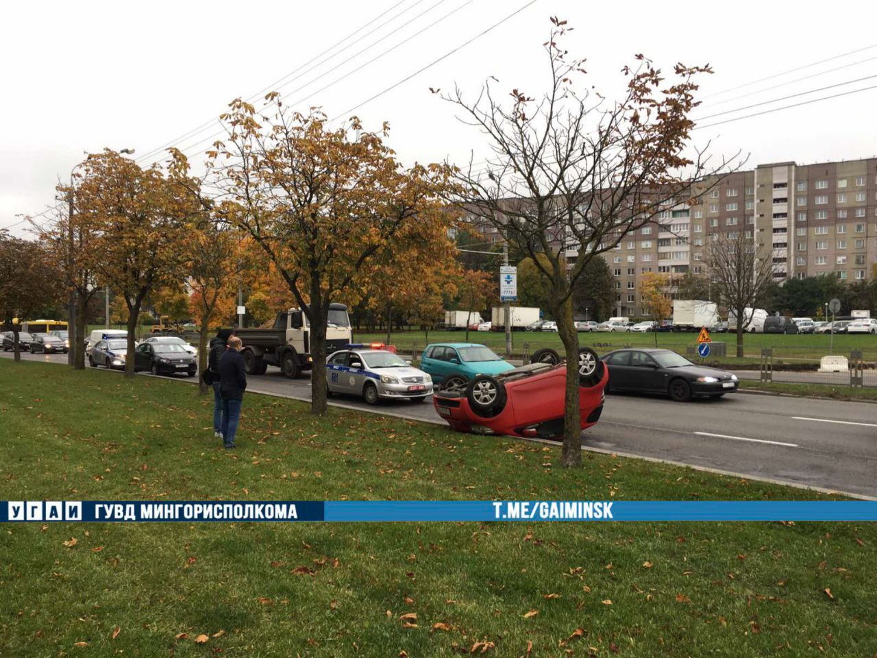 В Минске на проспекте авто наехал на бордюр и опрокинулся