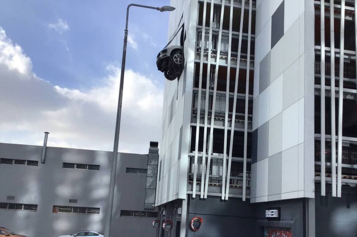 В Москве Porsche российского хоккеиста пробил стену паркинга. Передняя часть автомобиля повисла в воздухе на высоте третьего этажа