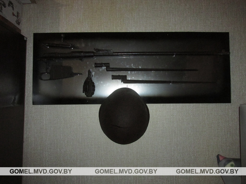 Мужчина сделал инсталляцию из затвора винтовки, штыка, части ударно-спускового механизма, ствола винтовки и ручной гранаты Ф-1 с запалом. Также в квартире милиционеры нашли каску времен Великой Отечественной войны, патроны и гильзу. Все боеприпасы изъяты и отправлены на экспертизу. Мозырский РОВД проводит проверку.