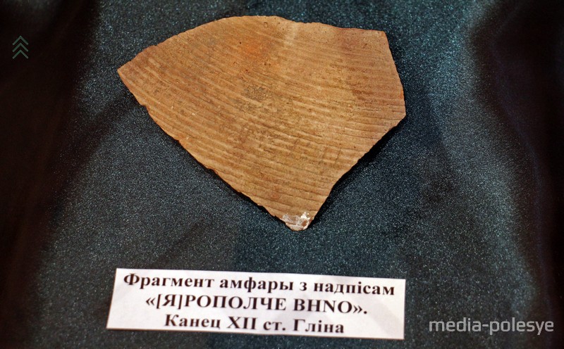 Первый – фрагмент амфоры с надписью «Ярополче вино». Он датируется концом XII столетия. Считается, что пинский князь Ярополк отмечал свою свадьбу, когда ему привели в глиняных амфорах вино с территории современной Украины. Осколок нашли при раскопках.