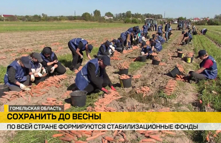 На поле хозяйства «Можейково» в 30 рук собирают морковь. Спешат, пока за окном сухо и солнечно – в день вот так успевают обработать до 50 соток. Весь урожай сразу отправляют в ближайшее хранилище. Позже сюда же пойдeт картофель, свёкла, капуста и яблоки – знаменитый «борщевой набор», который и составляет стабфонд.