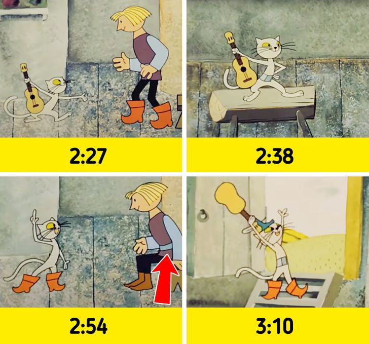 3. В мультике «Кот в сапогах» у кота постоянно меняется наличие одежды на нем. То он без ничего, то в поясе, то в одних сапогах...
