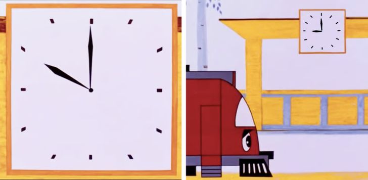 8. В мультфильме «Паровозик из Ромашкова» сообщается, что поезд прибывает ровно в 10 часов. И мы видим, что вокзальные часы сначала показывают правильное время, а когда поезд тронулся, стрелки почему-то застыли на цифре 9. Или, может, в этом мультфильме время идет в обратную сторону?