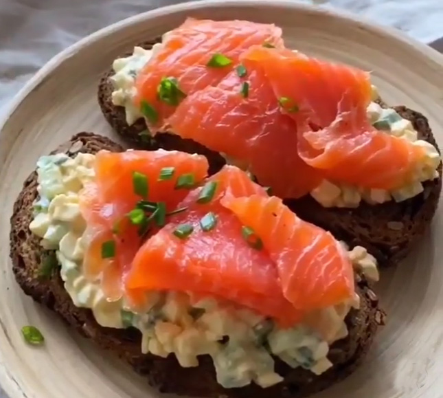 Сварите 2 яйца вкрутую. Мелко порежьте яйца, свежий огурец, зеленый лук. Добавьте 2 ст. л. сметаны, 1 ч. л. горчицы, соль и перемешайте. Поджарьте ломтики черного или белого хлеба, выложите на них яичный салат, сверху положите кусочки красной рыбы, украсьте зеленым луком.