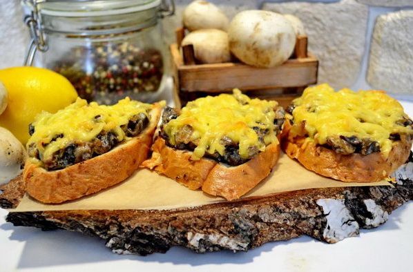 Обжарьте шампиньоны с луком, подсолите. Ломтик белого хлеба смажьте сметаной, выложите грибную начинку, посыпьте тертым сыром и отправьте в разогретую до 200 градусов духовку на 15 минут.