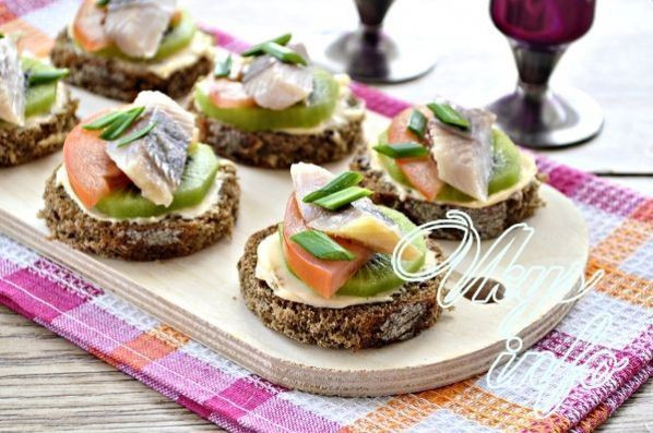 Вырежьте из хлеба мякиш с помощью стакана – получатся кружочки. Смажьте каждый сливочным маслом и положите на него кружок киви, кусочек филе сельди и дольку помидора. Сверху украсьте зеленым луком.