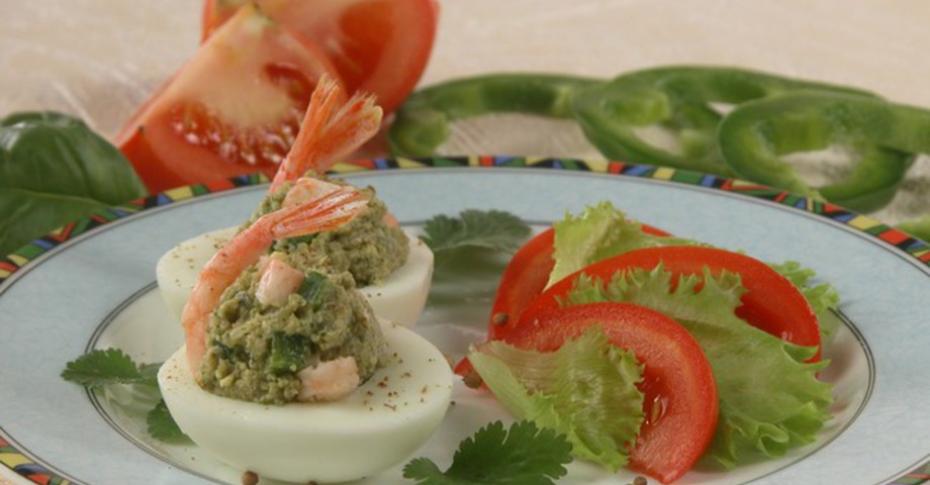 Яйца с креветками, фаршированные авокадо