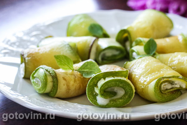 Творожный сыр посолите, поперчите по вкусу, добавьте мелкорубленную зелень. Обжарьте порезанные тонкими слайсами баклажаны или кабачки на гриле без масла. Заверните начинку.