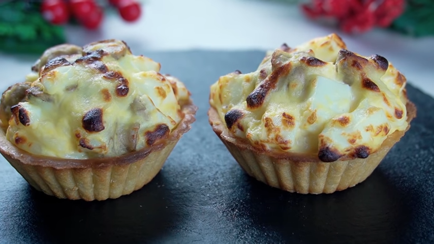 На одну тарталетку возьмите 1 ст. л. жареных грибов, половину вареного яйца, 1 ч. л. тертого твердого сыра, греческий йогурт, соль специи для заправки. Запекайте в разогретой до 200 градусов духовке 10 минут.