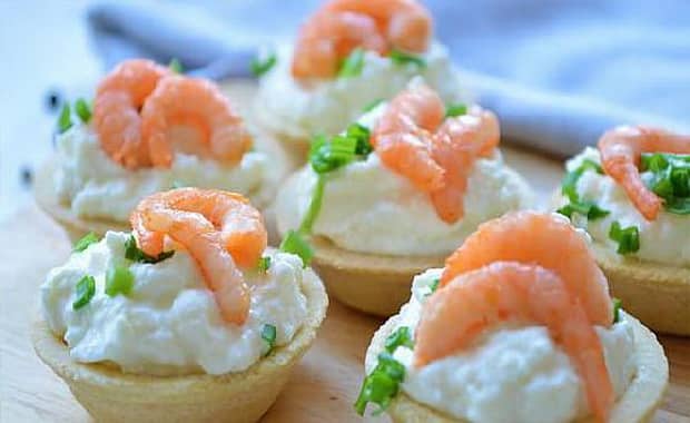 300 г творожного сыра и 300-400 г вареных креветок измельчите блендером до однородной массы. Наполните начинкой тарталетки. Можно украсить вареными очищенными креветками, свежим огурцом и зеленью.
