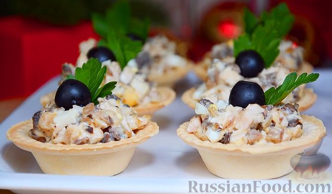 Отварите 500 г куриной грудки со специями, 300 г мелко порезанных шампиньонов обжарьте с луком, 3 яйца сварите. Порежьте мелкими кубиками яйца и куриную грудку. Смешайте, добавьте майонез. Разложите в тарталетки примерно по 1 ст. л. начинки.