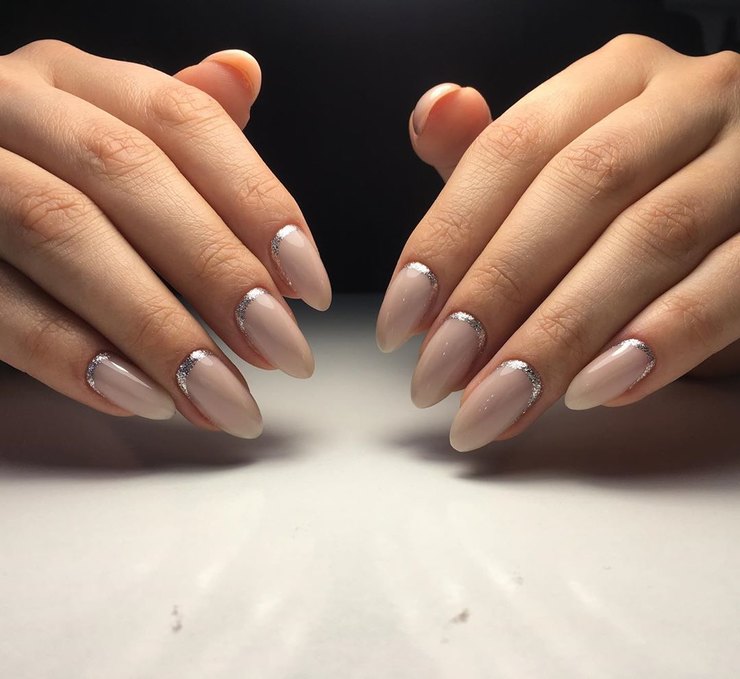 5. Еще один простой вариант – лунный маникюр. Отросшие участки нужно просто аккуратно заполнить блестящим лаком. Чтобы избежать попадания на накрашенную часть, можно использовать наклейки у отросшего края ногтя, которые не позволят выходить на лишние участки. И не забудьте сверху снова покрыть все бесцветным лаком.