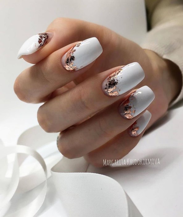 3. Ещё один отличный вариант – голографические «листы» у основания ногтя. Сначала нужно покрыть ноготь прозрачным лаком и, не дожидаясь пока он высохнет, с помощью пинцета аккуратно расположить аппликации по границе гель-лака. Сверху нужно снова покрыть ногти прозрачным слоем.