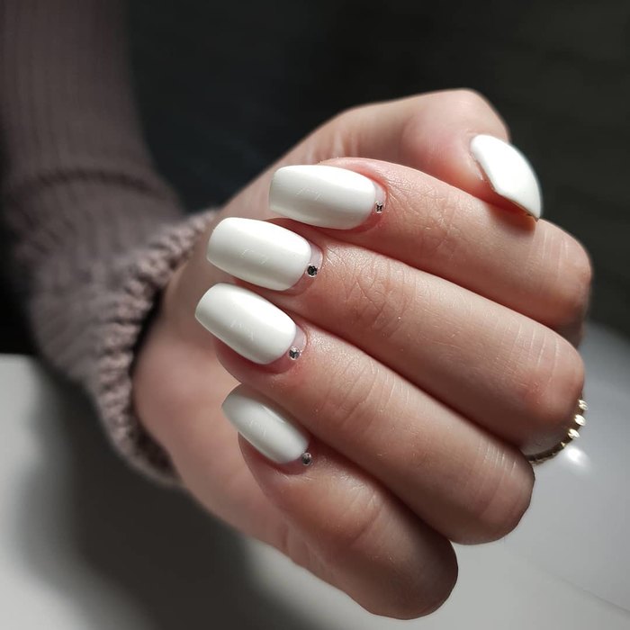 1. Можно наклеить на отросший участок небольшие стразы. В минималистичном варианте – один по центру, а при более смелом варианте – стразы могут заполнить все пространство у кутикулы. Главное – зафиксировать сверху камушки прозрачным лаком.