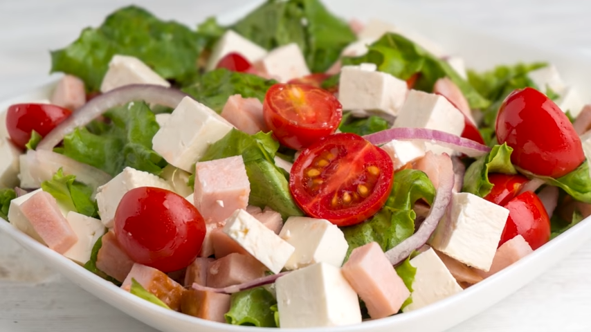 Порежьте небольшую красную луковицу полукольцами, 100 г листьев салата порвите на кусочки, 200 г помидоров черри разрежьте пополам, 150 г брынзы и столько же ветчины порежьте кубиками. Все смешайте и заправьте оливковым маслом.