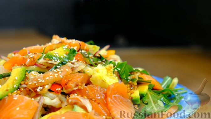 Тонко нарежьте небольшую луковицу и замаринуйте ее в лимонном соке, подсолите немного. Оставьте на минут 5-7. Свежий огурец и болгарский перец, 200 г красной соленой рыбы нарежьте тонкой соломкой, авокадо – ломтиками. 200 г салата айсберг порвите на мелкие кусочки. Сделайте соус – смешайте 3 ст. л. растительного масла, 2 ч. л. горчицы и 4 ст. л. соевого соуса. В тарелку выложите салатные листья, лук, затем немного соуса, потом рыбу и авокадо, снова салатные листья и лук, рыбу и авокадо. Полейте соусом и посыпьте кунжутом.