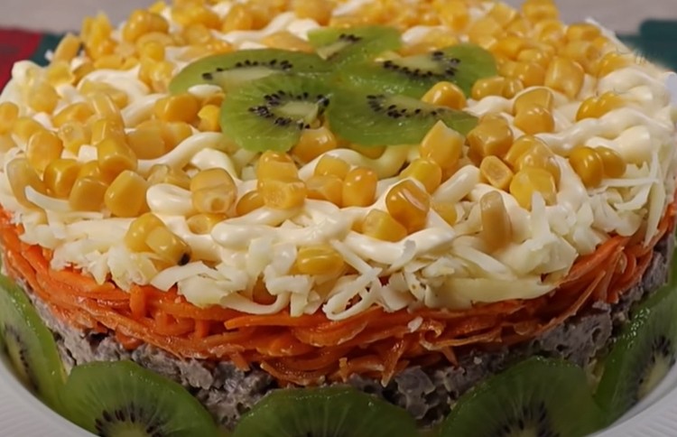 Нарежьте соломкой 500 г отваренной говядины, смешайте ее с майонезом, добавьте любимые специи, пряные травы. 2 тертых яйца в отдельной миске тоже смешайте с майонезом, добавьте по вкусу специи. На плоскую тарелку в разъемное кольцо выкладывайте слои: подготовленные яйца, мясо, 150 г корейской моркови, 200 г тертого сыра. Сеточкой сверху нанесите майонез, выложите консервированную кукурузу, украсьте салат слайсами киви.