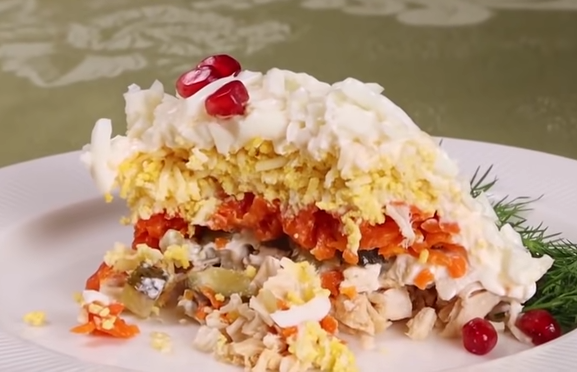 Каждый слой салата нужно смазывать майонезом. Отваренную куриную грудку мелко нарежьте, выложите на плоское блюдо. 2 соленых огурца порежьте мелкими кубиками и положите на мясо. Следующий слой – 2 моркови, отваренные и натертые. Затем мелко натрите 200 г твердого сыра и 3 желтка, смешайте и выложите поверх моркови. Смажьте майонезом верх и бока салата. Натрите белки 3-х яиц и украсьте ими блюдо сверху и по бокам. При желании зернами граната можно выложить рисунок.