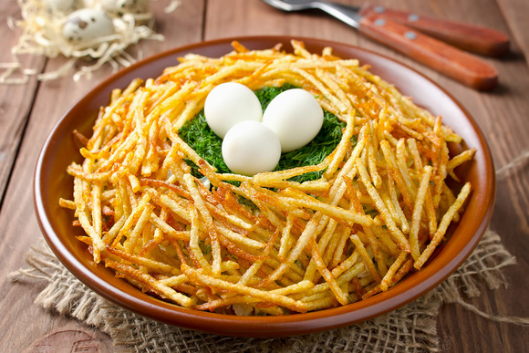 200 г отваренного куриного филе, 2 куриных яйца, 2 небольших свежих огурца нарежьте кубиком. Измельчите половинку луковицы. Все перемешайте, добавьте майонез, посолите по вкусу. На плоскую тарелку горкой положите салат, сделайте в центре углубление. Картофельную соломку выложите сверху, чтобы она закрыла салат. Мелко порубите укроп и насыпьте в углубление. На укроп положите 2 сваренных перепелиных яйца.