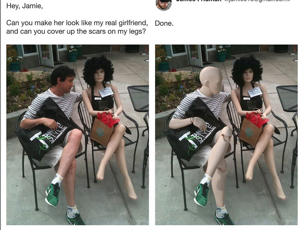 5. «Джеймс, сделай так, чтобы она выглядела реально, как моя подружка, а еще можешь скрыть шрамы на моих ногах?»