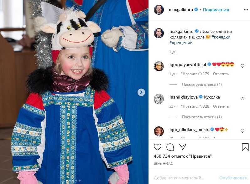 Российский юморист и актер, ведущий телепрограмм Максим Галкин разместил в интернете кадры с колядных гуляний, в которых приняла участие его малолетняя дочь Лиза. На фото семилетняя малышка запечатлена в шапке с бычком и облачена в народный костюм.