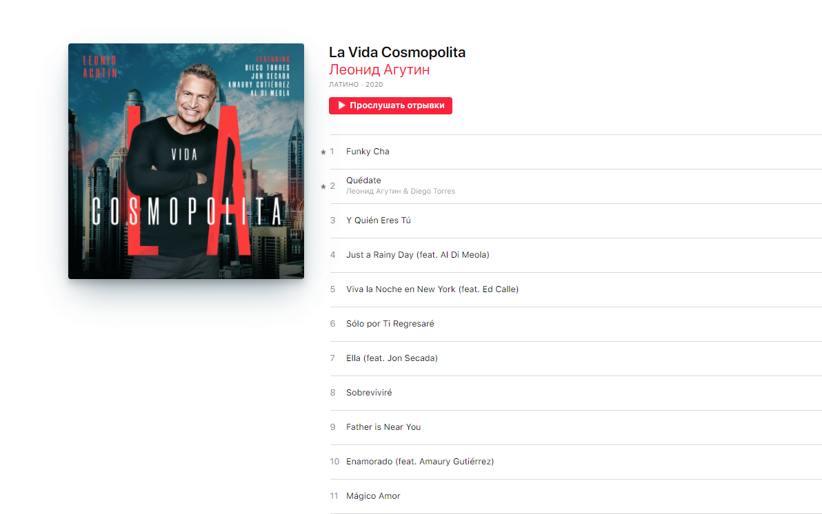 La Vida Cosmopolita Леонид Агутин выпустил 27 марта. В альбоме – 11 треков. Над ними работали музыканты из России, Колумбии, Кубы, Венесуэлы, Пуэрто-Рико, Никарагуа, Аргентины и США.