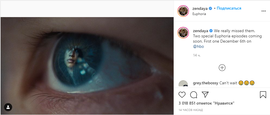 Актриса Зендая в своем Instagram анонсировала выход двух специальных эпизодов драматического сериала «Эйфория», в котором исполнит одну из ролей.
