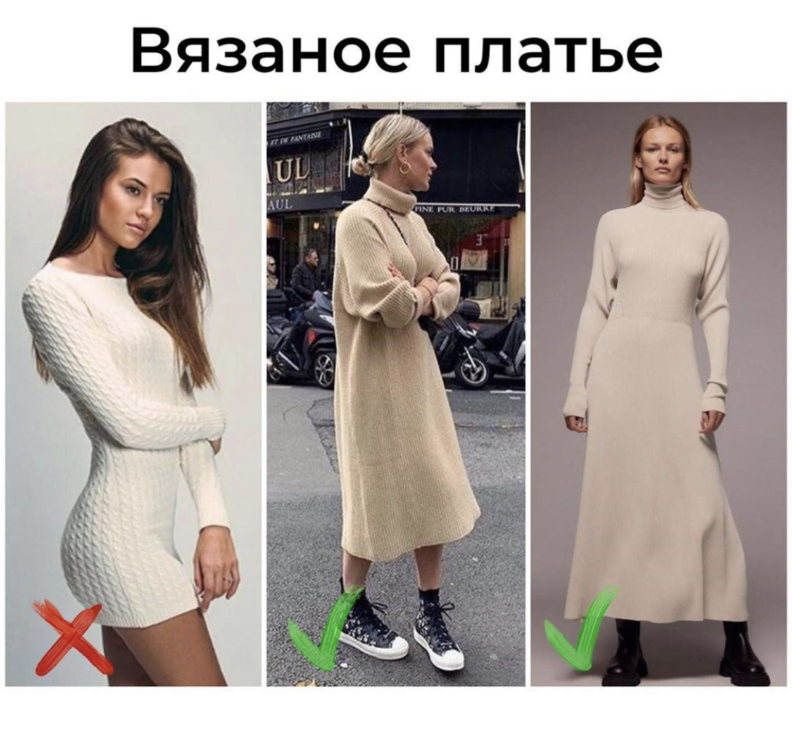 - Обтягивающее вязаное платье длиной выше колена. Крупная и излишне фактурная вязка, длина мини, обтягивающий силуэт уже не подойдут. Выбирайте платье оверсайз с прямым или полуприлегающим силуэтом длиной ниже колена.