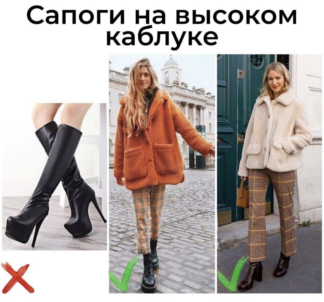 - Сапоги на высокой шпильке с платформой. Девушки, которые купили их когда-то давно и изредка надевают их, страдая при этом от неудобства, сейчас обрадуются. Да-да, сейчас тренд на удобство и комфорт, поэтому такие сапоги уже не вписываются в 2020–2021. Что лучше купить? Ботинки, сапоги на устойчивом каблуке.