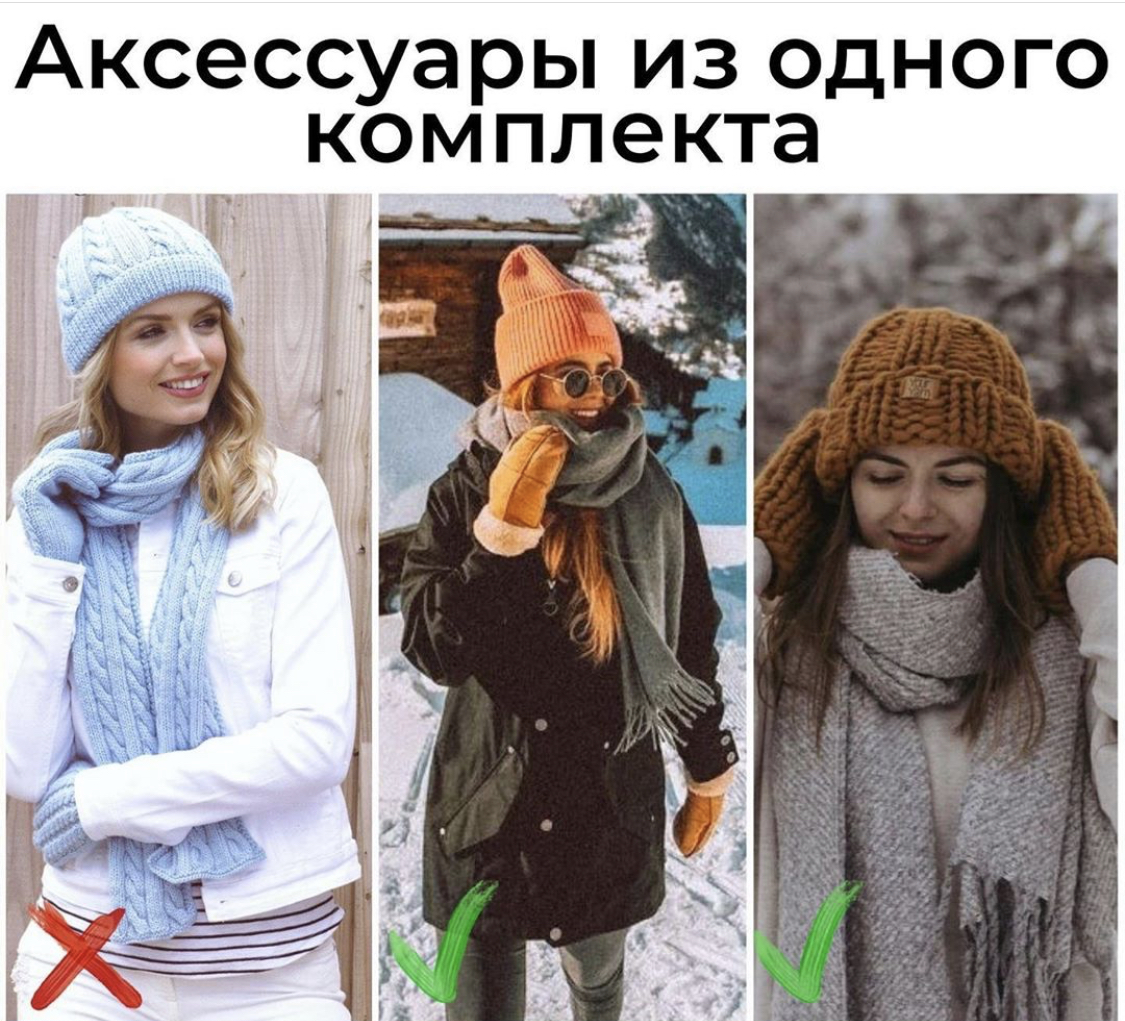- Шапка, перчатки и шарф одного комплекта. Конечно, куда проще купить всё одного комплекта и не мучиться над сочетанием, но это уже неактуально смотрится. Да, найти шапку и шарф идеально сочетающиеся между собой не так уж легко, но от этого образ будет современный и стильный. Экспериментируйте с фактурами, материалами и оттенками.