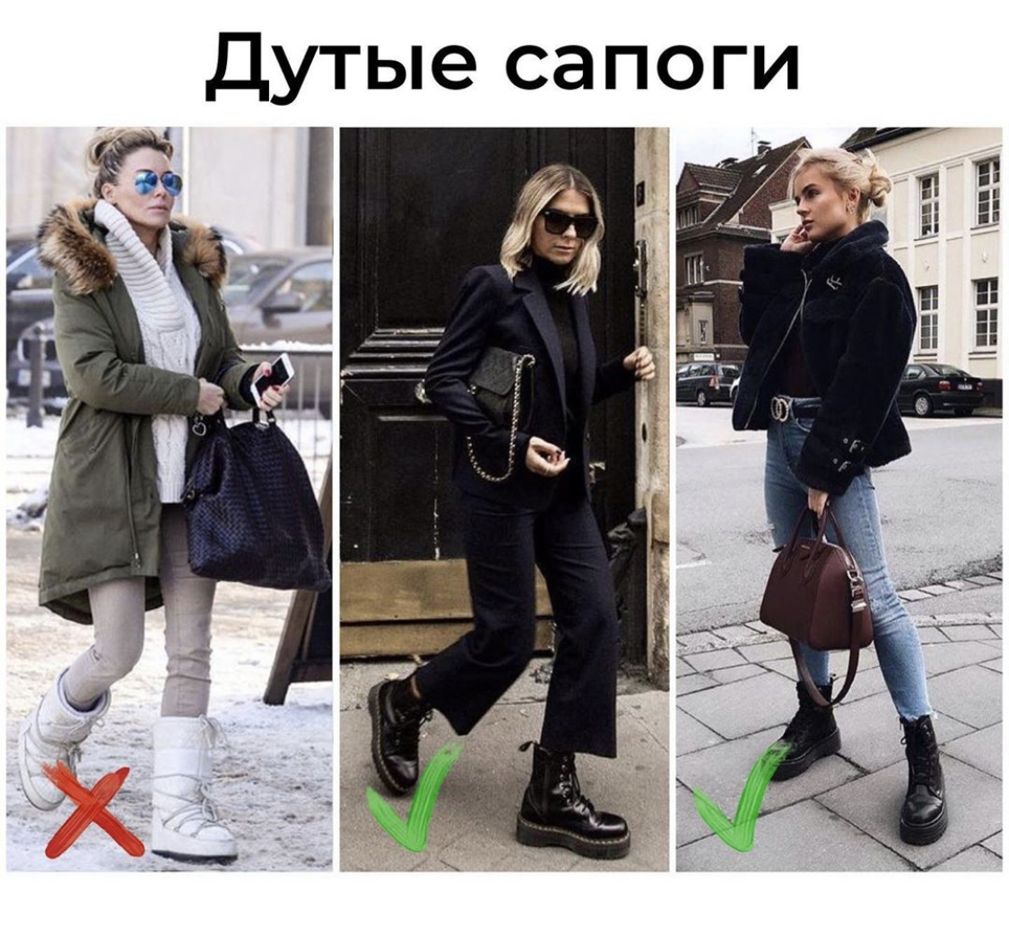 - Дутые сапоги. Один из самых странных зимних трендов, который уже давно канул в Лету. Городской образ с такими сапогами выйдет нелепым и неуклюжим, поэтому оставьте эту пару для зимних занятий спортом или поездок в лес.