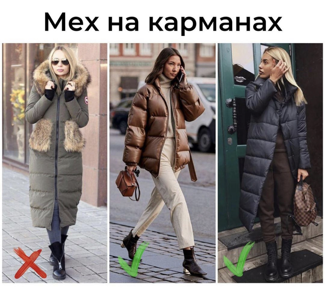 - Верхняя одежда с меховыми карманами, окончанием рукавов или воротником. Мех на карманах, рукавах или на болтающихся верёвочках от капюшона не прибавит образу изящности.