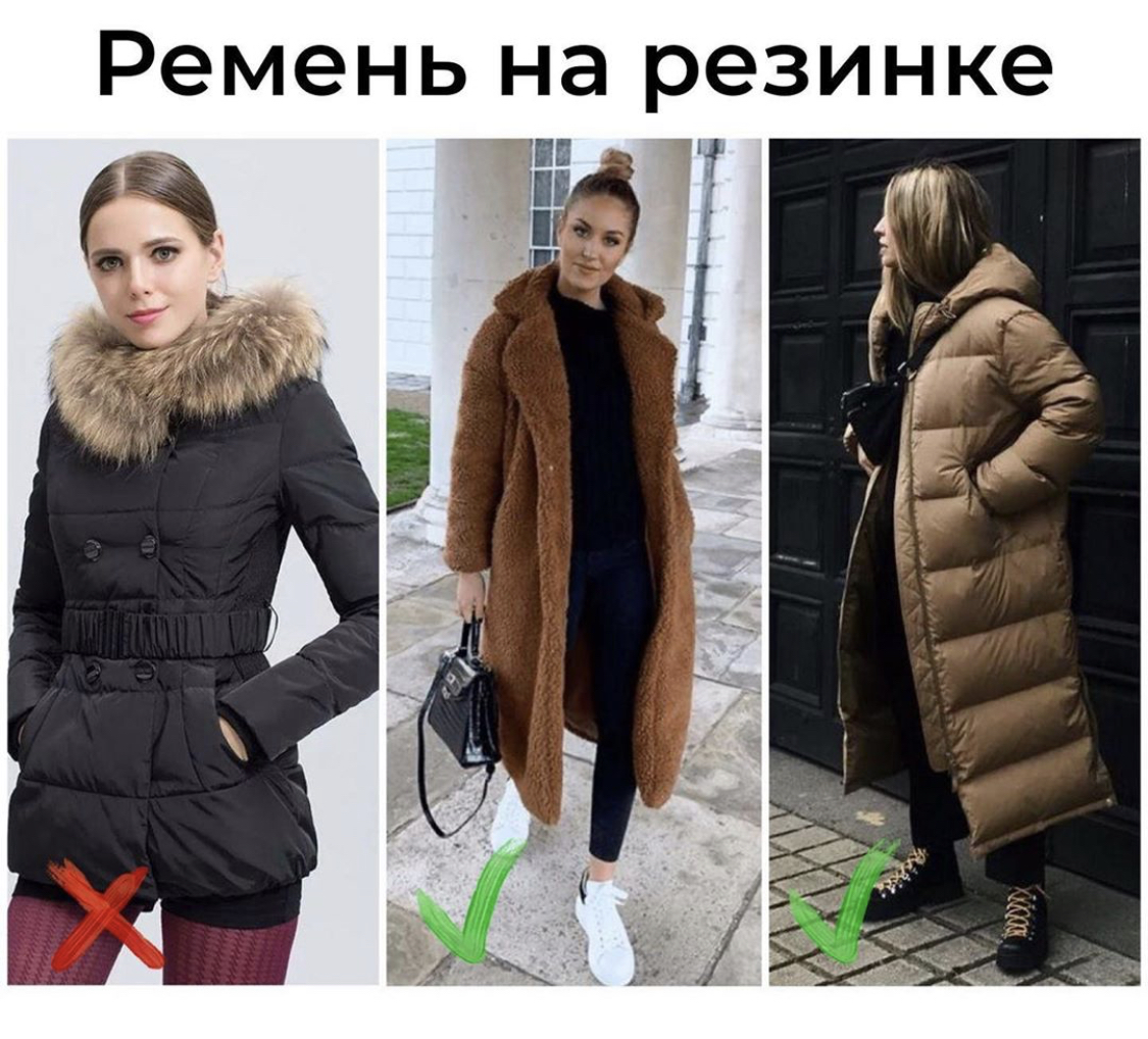 - Верхняя одежда с ремнём-резинкой. Наверняка, у вас был пуховик с таким ремнем, но уже давно пора о нем забыть. Сейчас отдавайте предпочтение прямому или свободному крою, либо одежде с широким ремнем.