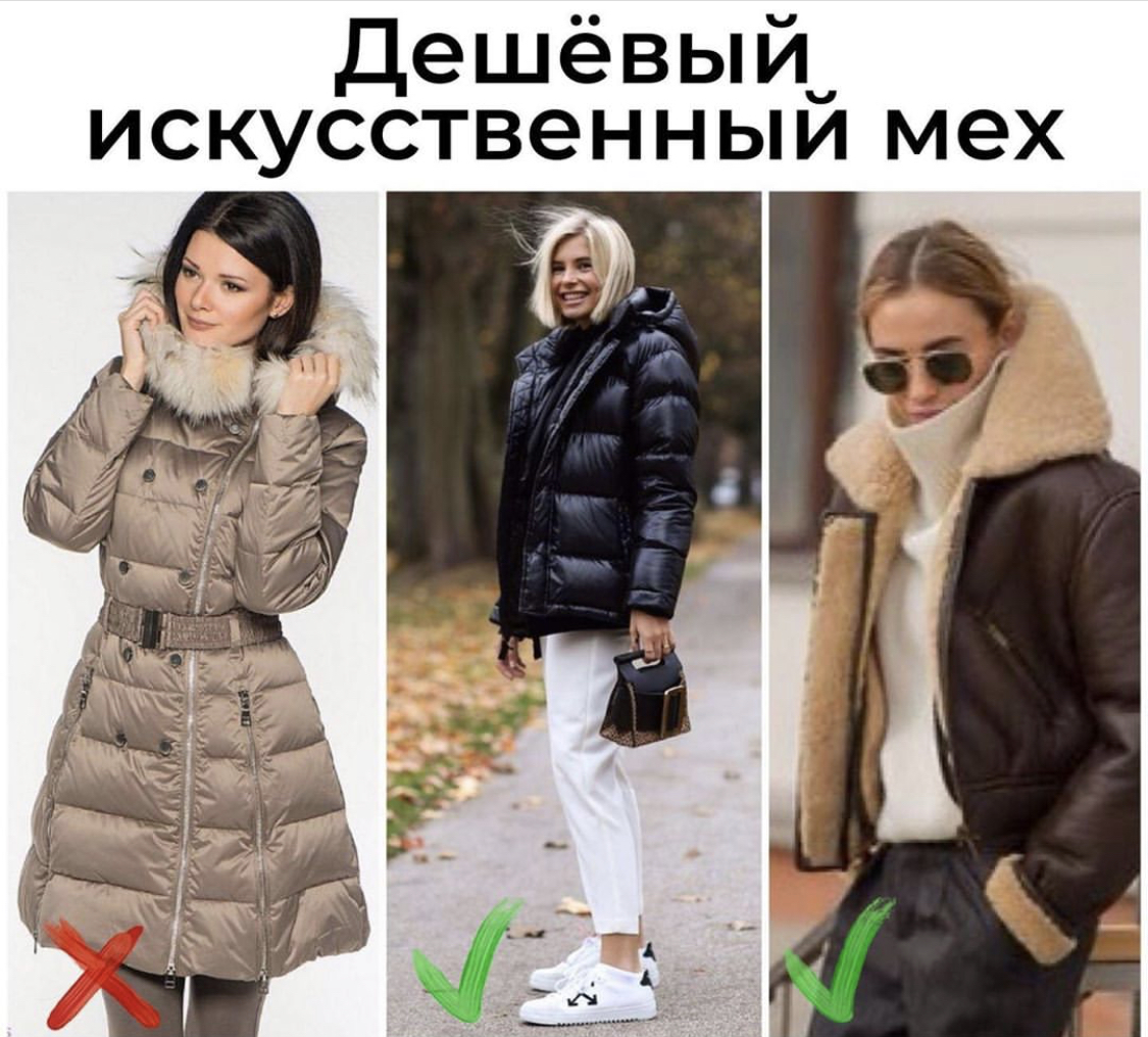 - Дешевый искусственный мех. Густой искусственный мех на капюшоне и воротнике уже давно не в моде. Гораздо лучше будет смотреться одежда без меха, а если вы хотите утеплиться, то всегда можно повязать шарф. Если эко-мех, то короткий, максимально приближенный к натуральному по внешнему виду.