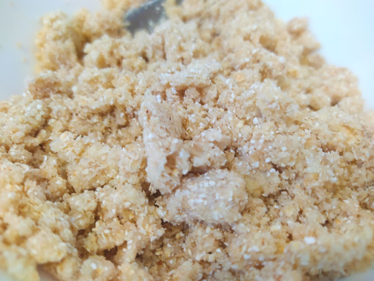 2. Овсянку и сахар смолоть в блендере. Добавить к ним манную крупу. Тщательно перемешать вместе со сливочным маслом.