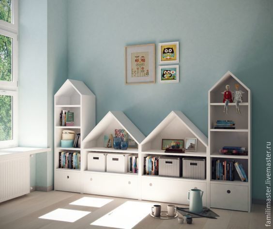 - Стеллажи – это находка для мамы. Сейчас можно найти много различных вариантов, фантазия производителей мебели не знает границ. Оригинально смотрятся стеллажи-домики.