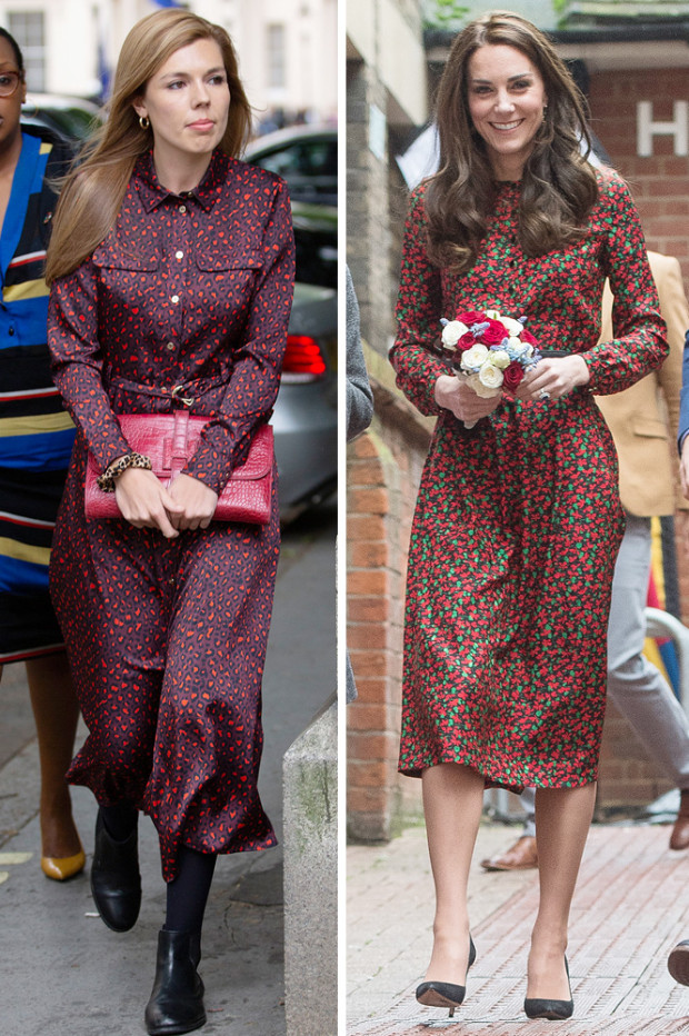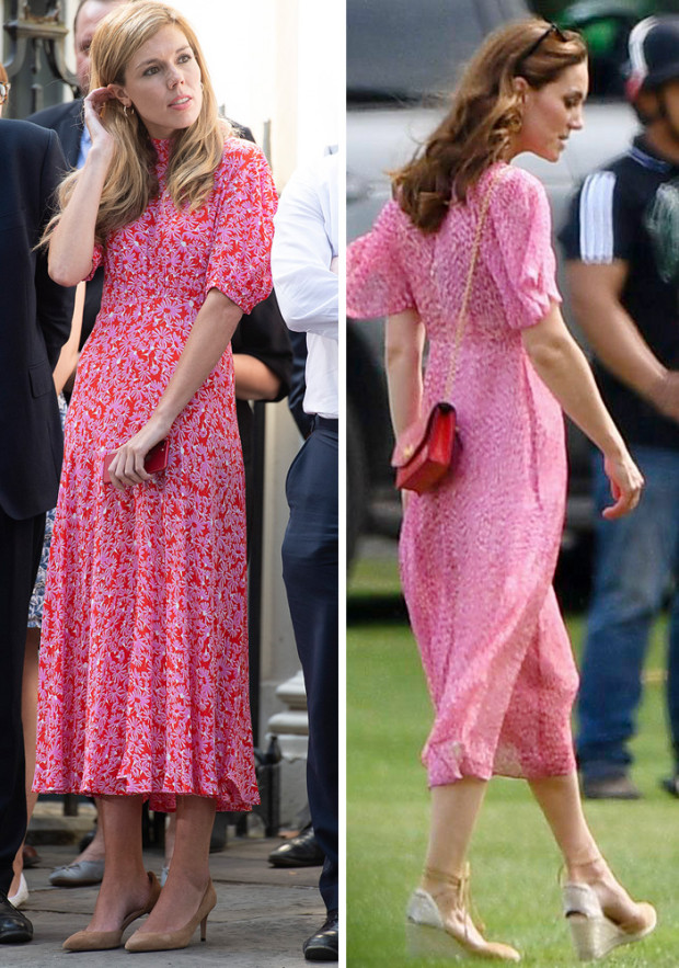 Во время церемонии назначения Бориса Джонсона на пост главы правительства Соединенного Королевства Керри Симондс была в красно-розовом платье с цветочным принтом лондонского бренда Ghost. Похожий наряд есть и у Кейт Миддлтон. Ранее она надевала это платье на игру в поло.