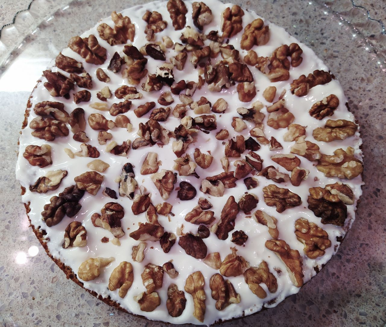 7. Нижнюю часть обильно смазать кремом. Выложить на него грецкие орехи.