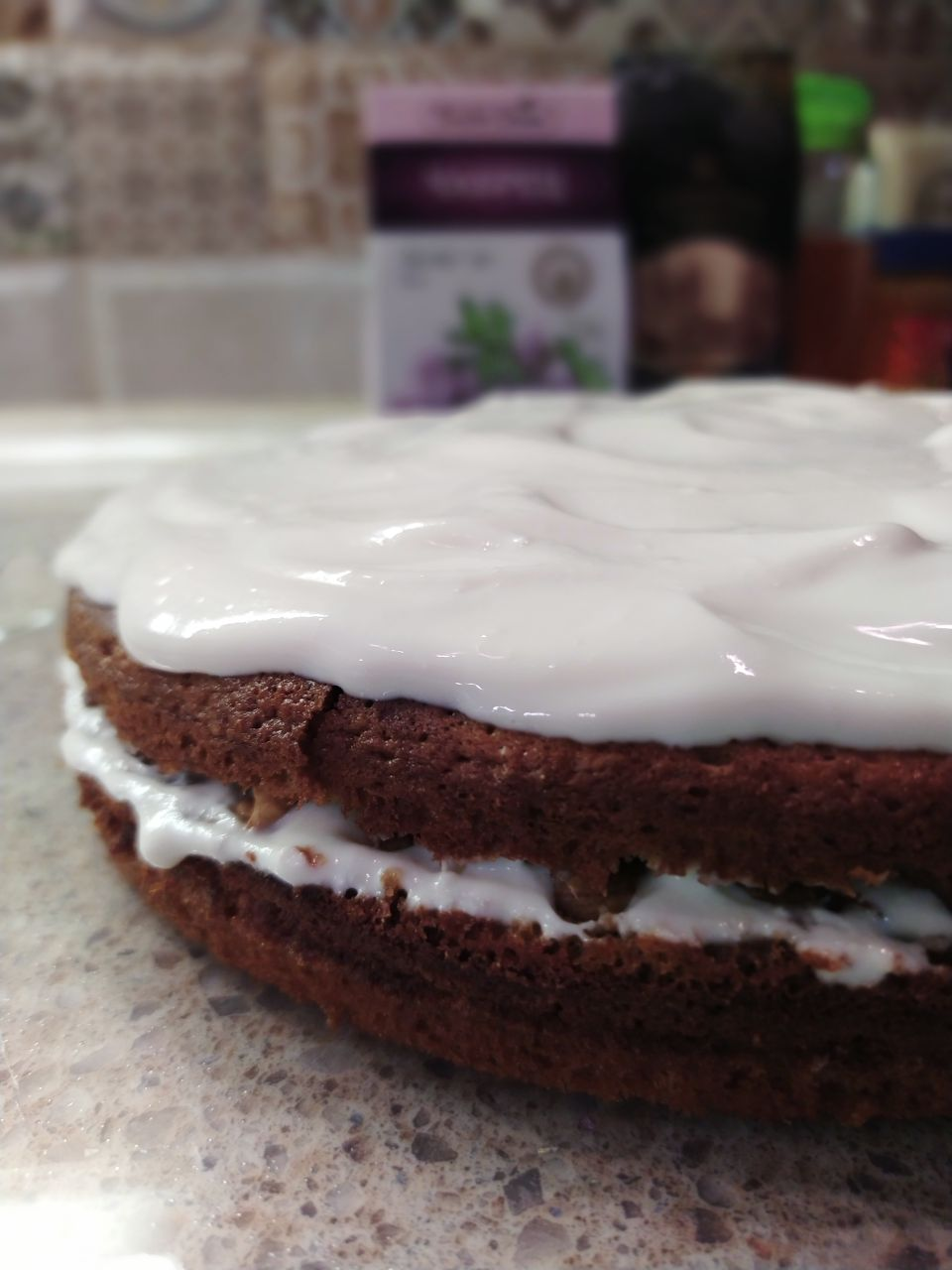 8. Соединить две части бисквита. Сверху смазать оставшимся кремом.
