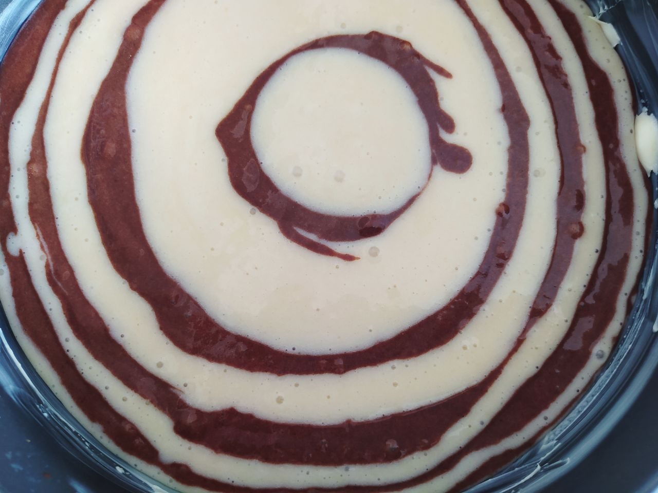 3. Разъемную форму диаметром 20 см смазать сливочным маслом. При помощи ложки вылить в форму тесто, чередуя светлое и тёмное.