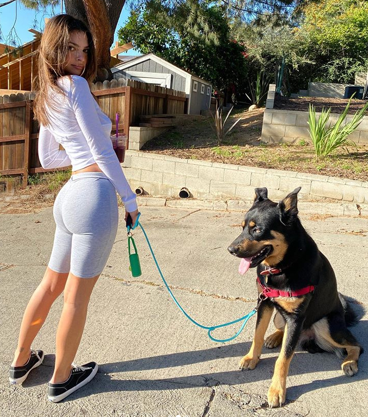 В кадре модель со своим псом Коломбо во время утренней прогулки. На Эмили – белый укороченный лонгслив и обтягивающие серые велосипедки. Спортивный лук дополнен черными кедами, а стаканчик со смузи в руках – завершающий штрих фитнес-образа модели.
