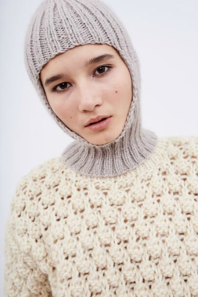 Вязаный капор с небольшим воротом, полностью открывающий лицо. Советуем обратить внимание на свободную модель тем, кто переживает за укладку: капор не так плотно прилегает к голове и не приминает волосы.