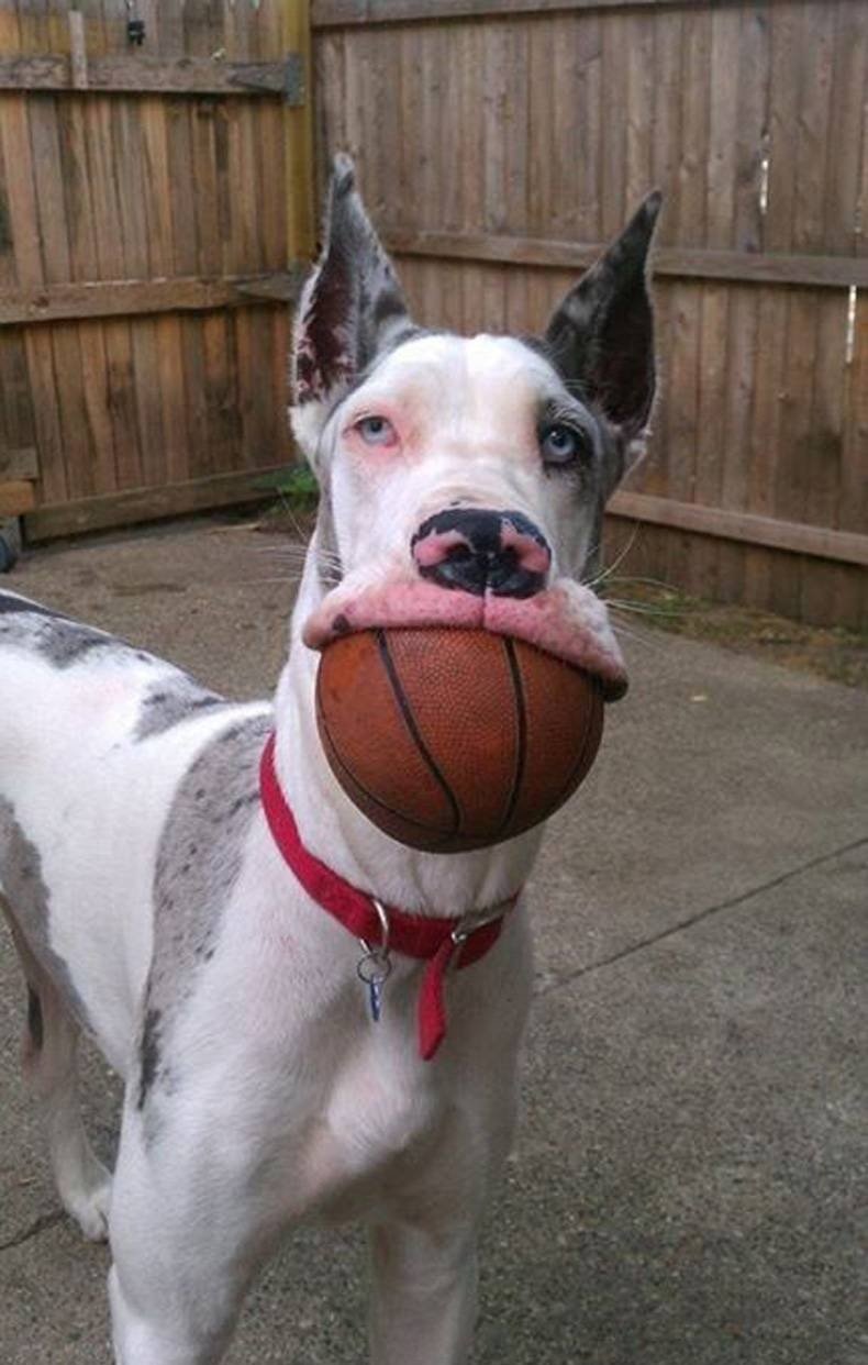 Интересно, это пасть у собаки такая большая или мяч небольшого размера?