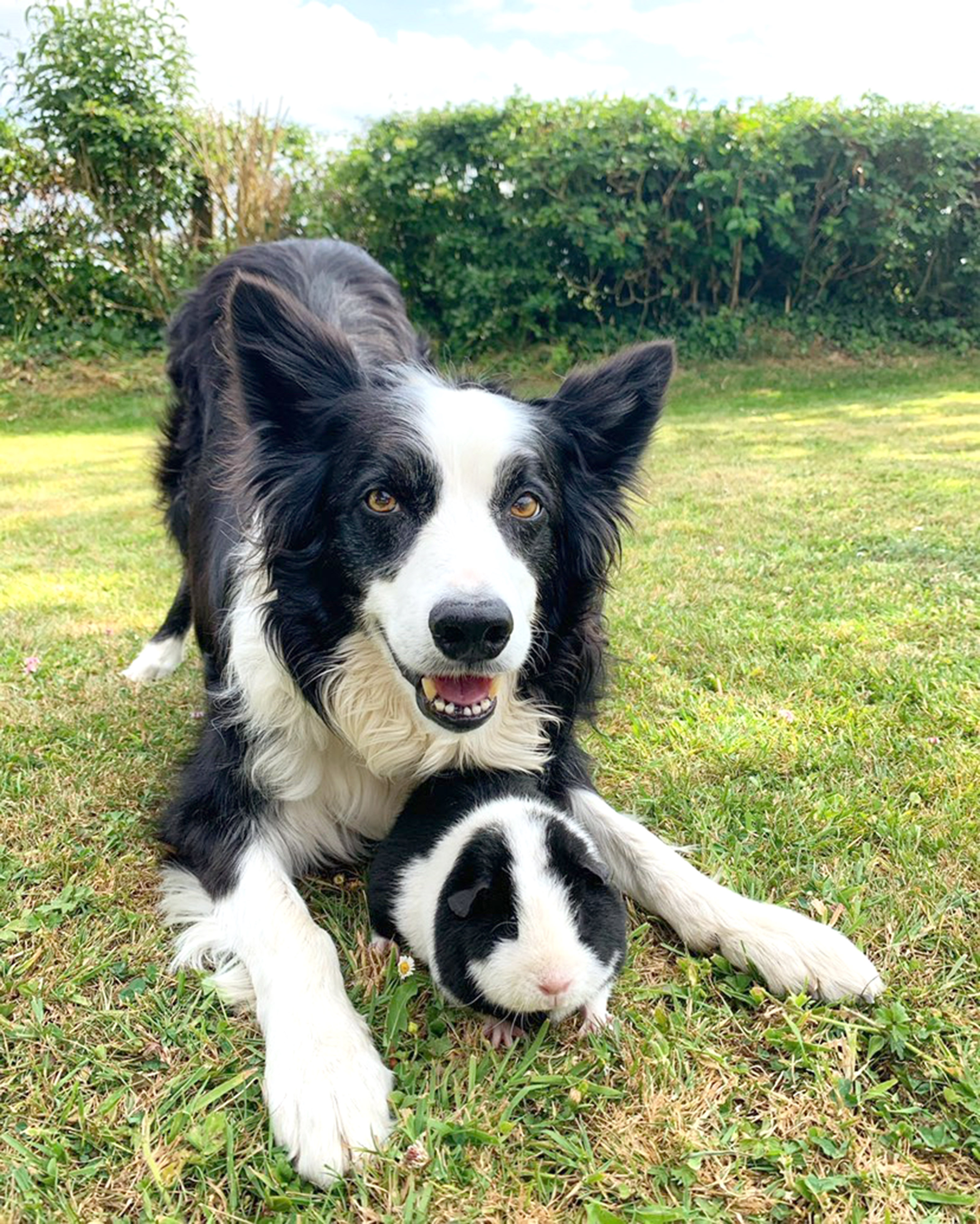 Морская свинка по кличке Марго и собаки Джордж и Дженсон живут в графстве Сомерсет. Несмотря на разницу в габаритах, между питомцами быстро завязалась крепкая дружба. «Марго стала по‑настоящему знаменитой благодаря своим отметинам, как у колли. И она прекрасно ладит с Джорджем и Дженсоном», – рассказала хозяйка животных Дженна Уэллс.